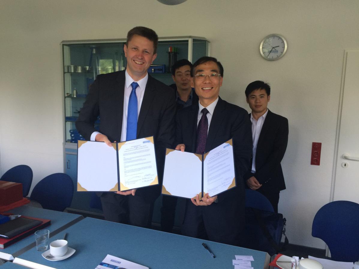 6月8日上午,陶杰教授一行赴ERICHSEN公司参加中德2015板材成形性能评价学术合作论坛。陶杰教授、郭训忠副教授详细介绍了BETWA西汉姆联在板材成形领域的研究进展。报告结束后,ERICHSEN公司与南航就具体的合作形式进行了讨论与交流并达成一致,初步拟定双方建立塑性成形联合研究室,在板材成形性能评价技术、成形设备研发领域建立长期的合作关系。最后,双方举行了战略合作协议签字仪式。下午,陶杰教授一行参观了公司生产部门,详细了解板材成形性能评价的整个过程,包括试样制备、影像采集、判断标准及数据处理,相关的技术人员进行了现场操作,并进行了详细讲解。