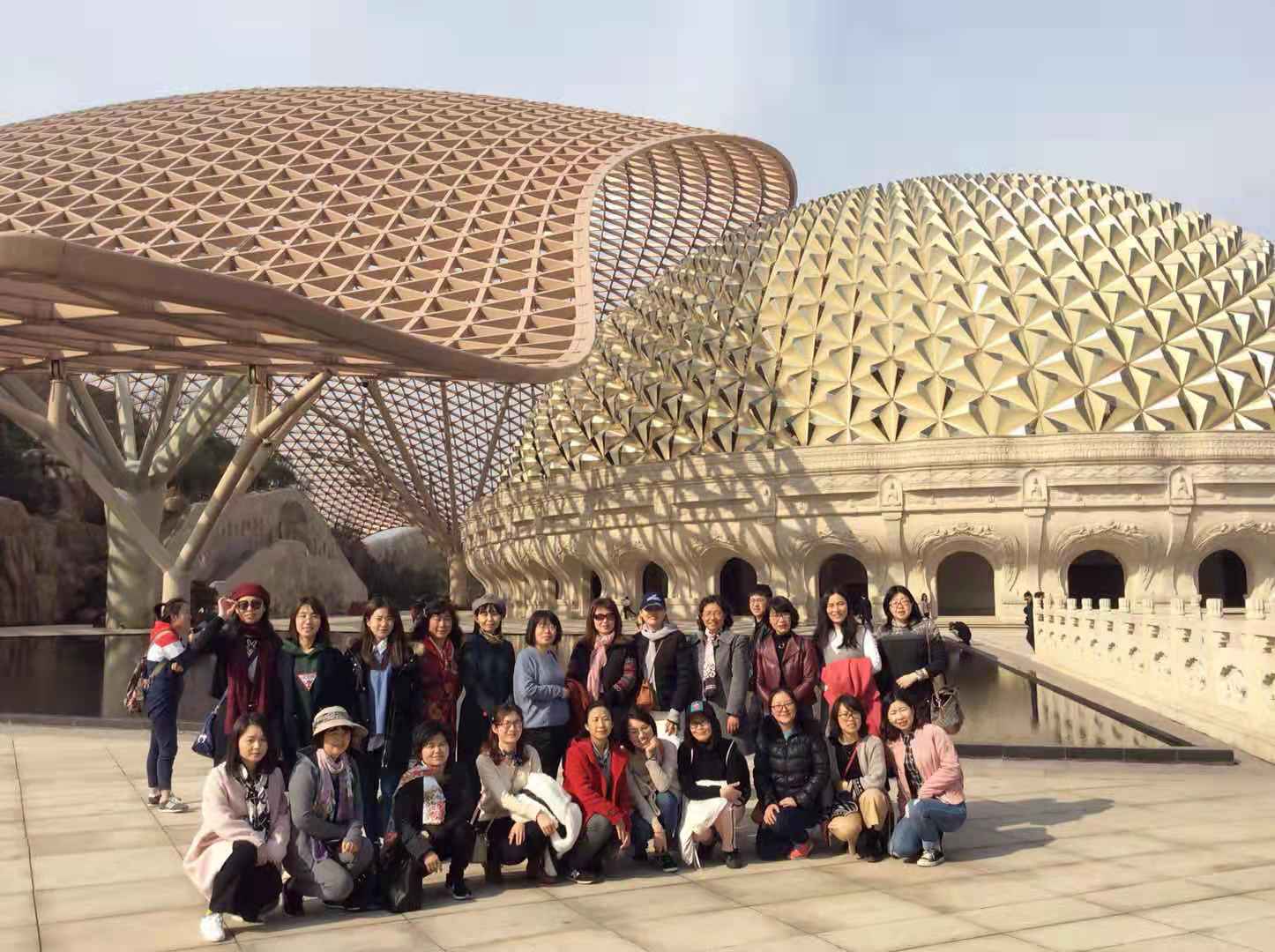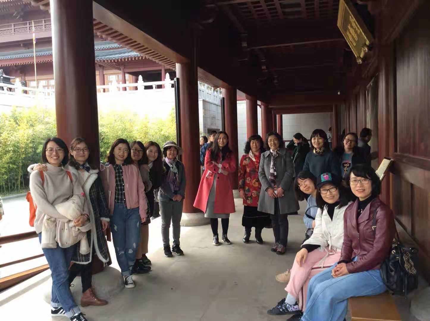 牛首山自然风光秀美,素有“春牛首”之美誉;佛禅文化源远流长,乃中国禅宗牛头一系牛头禅宗的开教处与发祥地。女教工们一行从牛首山东大门进入,跟随景区讲解员边走边了解寺院的布局设计,不断加深对中国佛教文化底蕴的理解。寺院建筑秉承唐代风格,中轴对称、重楼叠阁,玉砌朱栏、回廊曲折,屋顶两边嵌装有金黄色牛角状饰物。听着讲解员深入浅出,细致生动的描述,各位女教工时而低头沉思,时而眺目远望,时不时发问,加深自己对佛教文化的理解。一路走来春意盎然,梅花盛开,景色优美,与错落有致的园林设计,相映成趣。令大家惊叹不已,直呼不虚此行。随处可见的佛教文物,耳边飘过的佛教音乐,使空气中都含着丝丝佛教的蕴味,漫步其中,如浴春风般的美好。