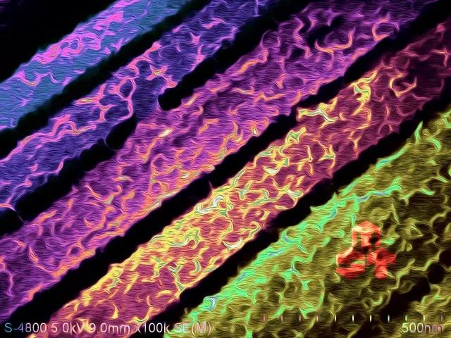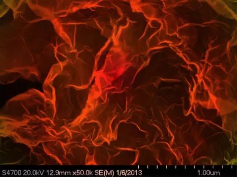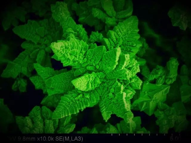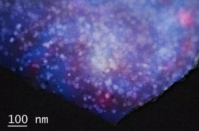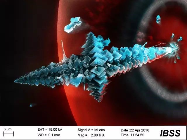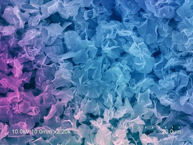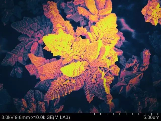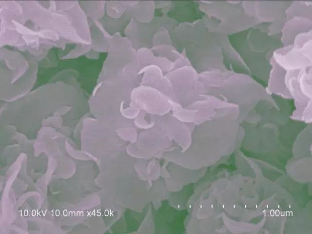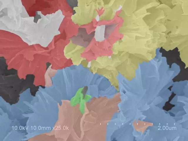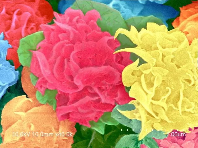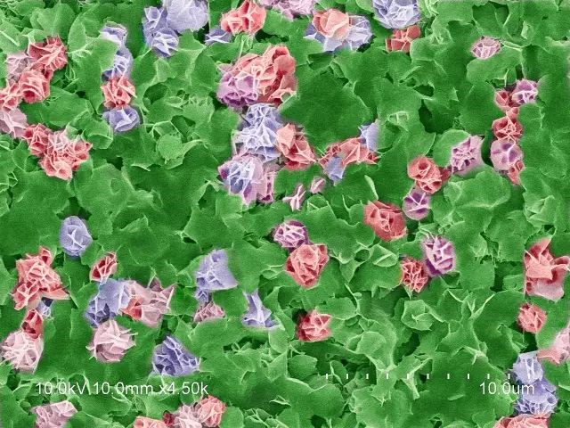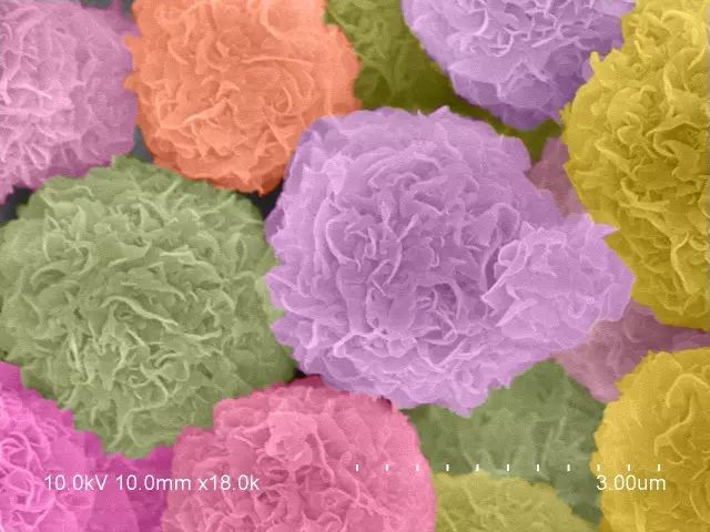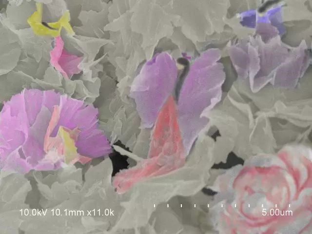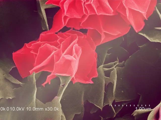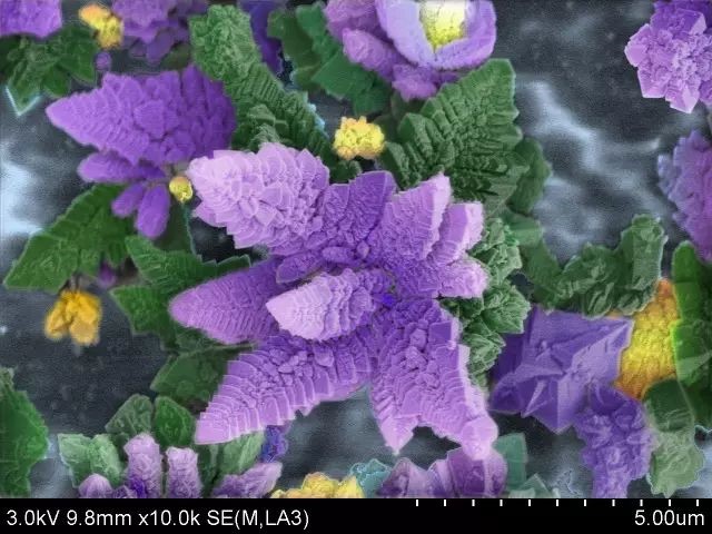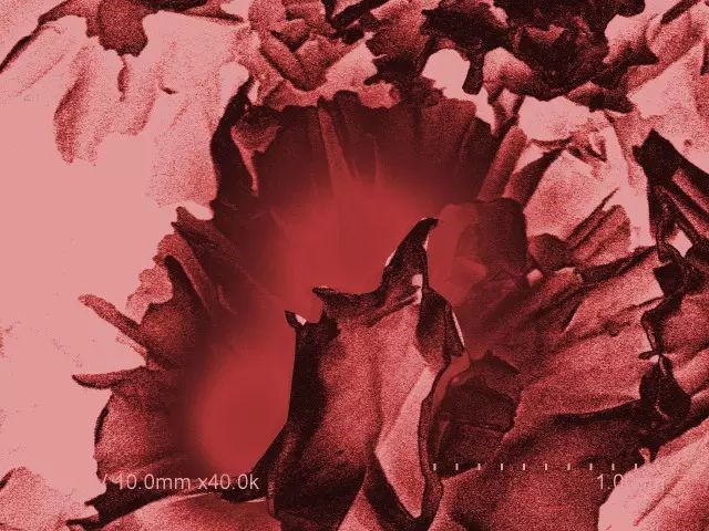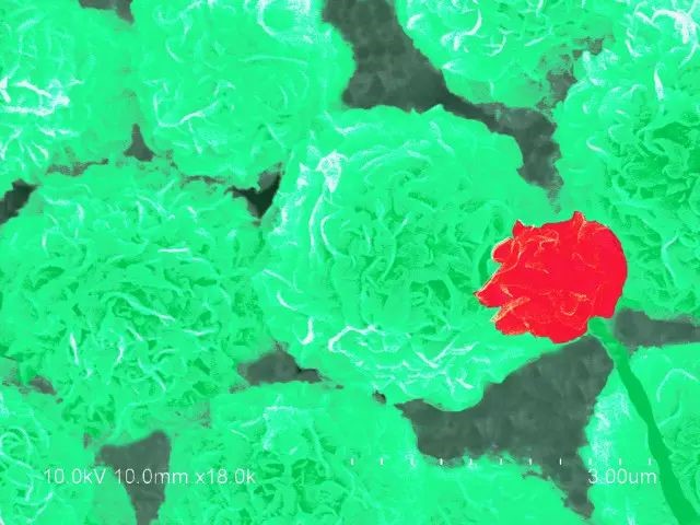 当看到图库里的电镜照片时,脑海中第一个想到的就是花丛,牡丹花这样富贵的大团花簇。于是给各个分明清楚的“花朵”加上了类似牡丹花的颜色。
