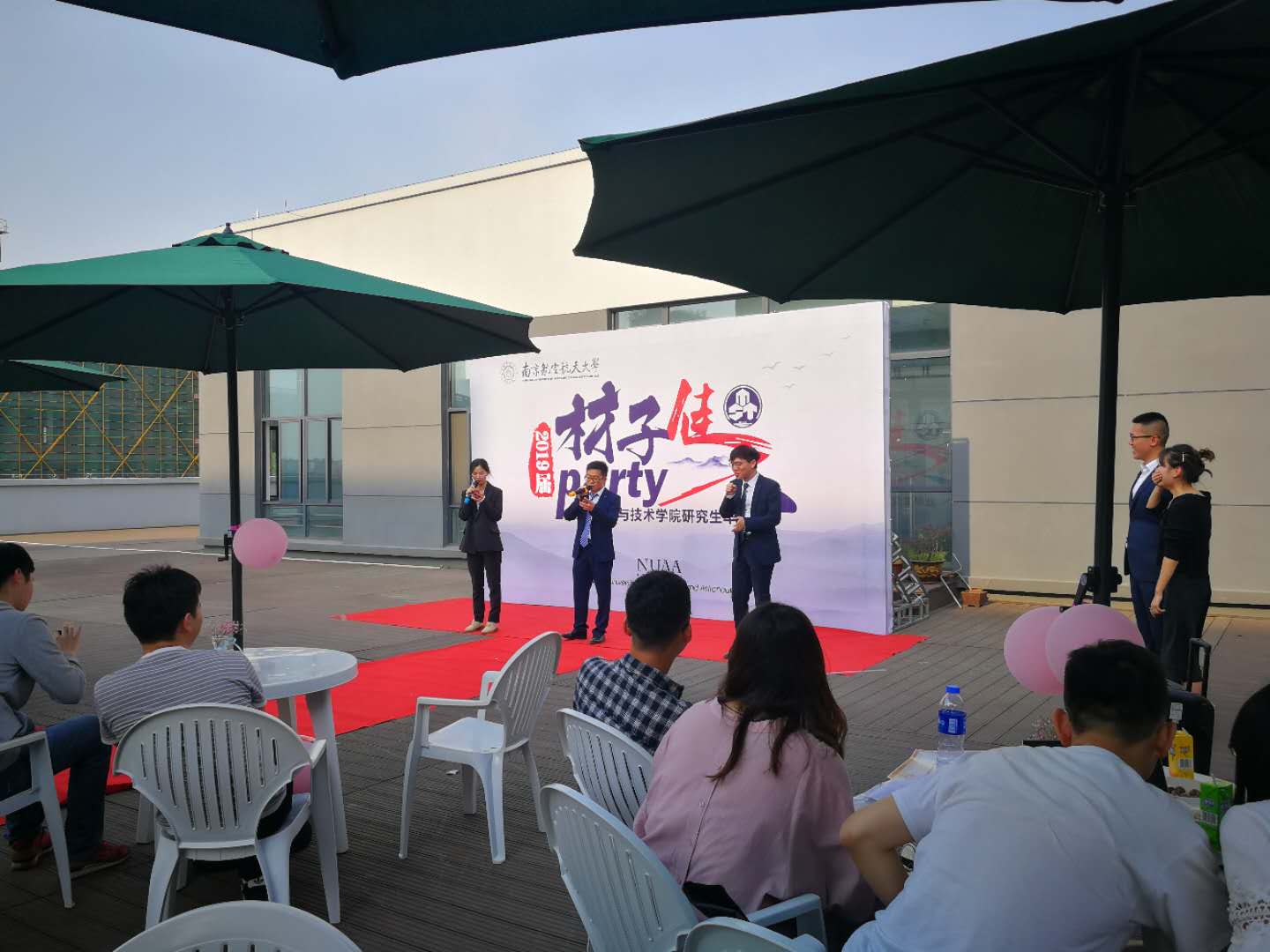 空中花园被气球和鲜花点缀,伴着抒情的旋律,毕业欢送会拉开了帷幕。首先,优秀毕业生代表陈虞、孙翔宇、石梦雨分享了自己与学院之间的故事,或幽默、或激情,真挚的话语赢得阵阵喝彩。