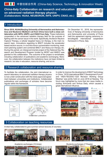 我院汤晓斌教授课题组从2015年起与意大利国家核物理研究院、意大利帕维亚大学开展科学研究、人才培养方面的国际合作。2016年,联合意大利合作单位申报获批了国家重点研发计划政府间国际科技创新合作重点专项——加速器硼中子俘获癌症治疗超热中子束设计与剂量优化。该项目多次得到中意两国外交、科技部门的关注,寄希望该项目成果能成为“一带一路”计划中意合作的实质性标志成果。由我院牵头,2018年12月我校与意大利帕维亚大学签署了校际合作框架协议;2019年10月又签署了两校共同成立“先进放射治疗物理国际合作联合实验室”协议。截止到今年下半年,中意双方互派本科生、硕士生和博士生交流联培共20余人次;科研人员联合发表学术论文33篇;共同举办了2018国际硼中子俘获治疗发展论坛;意大利帕维亚大学知名教授来校开设国际暑期课程4门。通过与意大利各科研机构的国际学术交流与合作,有利推动了我校核科学与技术学科的发展,实现了人才培养和科学研究的双赢,期待这些合作成果能成为我校国际化建设的标志性成果。