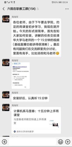2月8日学校正式发布《关于2020年春季学期教学工作安排的通知》后,学院迅速召开视频党政联席会,明确疫情防控期间在线教学实施方案,对春季学期有教学任务的教师进行了授课准备情况摸底调查,组建“六院线上教学工作微信群”,针对性地分享学习资料,安排已有智慧教学工具使用经验的教师开展相关技术指导和咨询,帮助教师克服畏难情绪,扫清入门障碍。