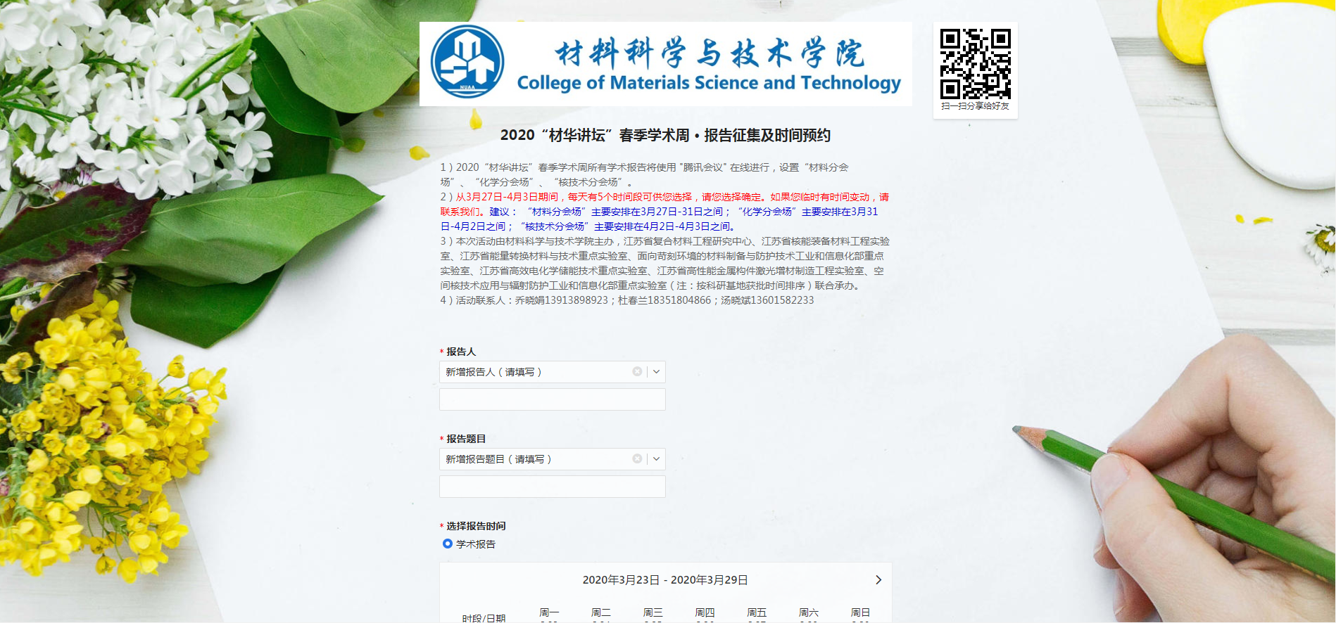 2020年3月27日—4月3日,必威BETWAY西汉姆联通过网络在线方式举办了2020“材华讲坛”春季学术报告周活动。由于新冠肺炎疫情影响,我校至今仍无法开学,广大学生也无法到校正常学习。材料学院贯彻落实“停课不停学”的学校要求,决定在此期间采用网络会议形式举办2020“材华讲坛”春季学术报告周活动,以期达到宣传南航材料学院、加强学术科研交流、推动本科生专业培养、开展研究生招生宣传等目的。
