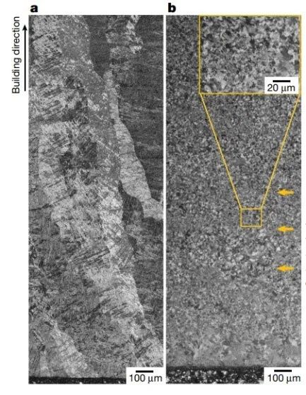 另一方面,激光增材制造工艺的创新(如将激光增材制造与超声振动、电磁场等多能场复合),可显著改善显微组织(如将柱状晶完全转变为细小等轴晶)及力学性能,且对不同金属材料具有普适性,如图3所示。