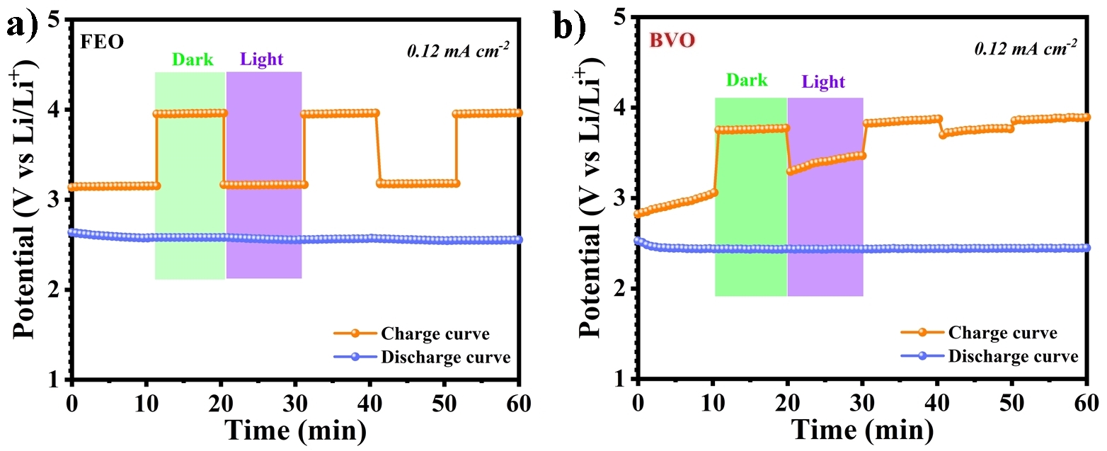 图2. (a-b) α-Fe2O3和BiVO4的在开关灯条件下的杂化水系锂-氧电池曲线图