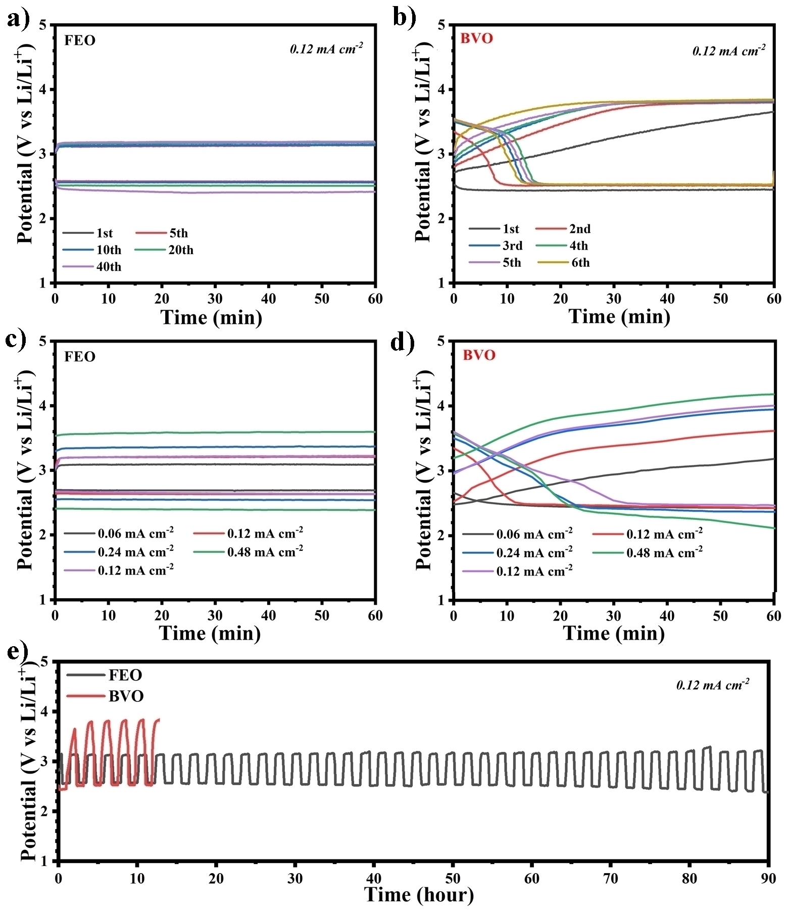 图3.α-Fe2O3和BiVO4的(a-b)电流密度为0.12 mA cm-2时的放电/充电曲线;(c-d)不同电流密度下的放电/充电曲线;(e)循环曲线图