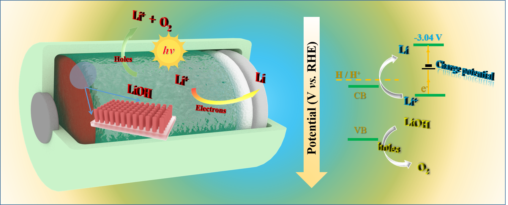 我们先前的工作(Energy Storage Materials 2018, 13, 49-56.),我们利用光照产生电子-空穴对,其中光生空穴用于放电产物过氧化锂的氧化,光生电子由外电路到达锂电极一侧。在这个过程中,过氧化锂为固态不溶性的产物,需要空气电极具有足够的存储空间。然而,有机电解液的毒性较大,在开放体系下容易发生挥发,造成电池性能的下降。同时,许多副反应也与电解液的稳定性有关,而这是绝大多数的光辅助电池所忽略的问题。高氧化性的空穴对电解液的稳定性造成很大影响,不利于长时间的循环。