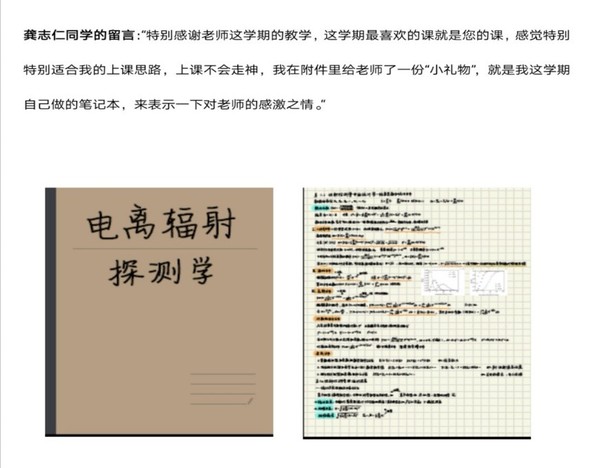 这份笔记,详细记录了这门课程的重要知识点,工整的字迹足见龚志仁对课程的喜爱。张老师表示,这份特殊的礼物,是对他教授《电离辐射探测学》这门课十多年来的最好嘉奖。回忆起二十余年的教书历程,张老师感慨道:信息时代下,学生获取知识渠道多、速度快、效率高,仅仅在课堂上传授知识已经远远不能满足学生的需求。作为老师,应该将获取知识的过程还原给学生看,培养学生思维习惯,帮助学生构建知识体系。他强调,2018年全国教育大会以来,高校中开展了教育思想大讨论,让教育工作者统一思想,推进四个回归,建设高水平本科教育,提高人才培养质量,这需要大家共同努力,进而营造优良的教风学风。因此,他希望有更多的同学看到这份学习笔记,大家相互借鉴、交流学习方法,共同提高学习效果。