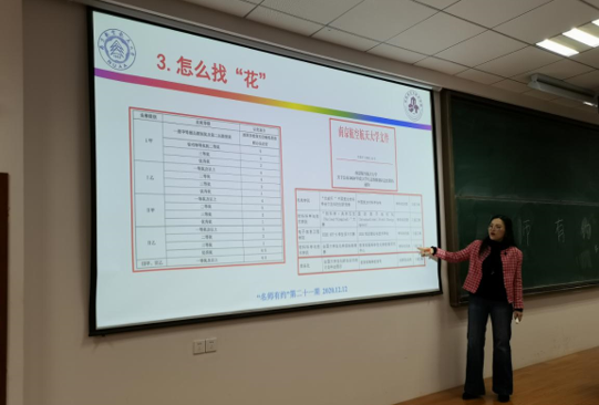 讲座正式开始,潘蕾以南京是锦织物的发源地为开头,讲述了本次讲座以锦上添花,你织“锦”,我养“花”为题目的原因,引出了本次讲座的内容。潘蕾将锦比作同学们的学习过程,而花则是在学有余力时寻找老师参与科研项目的过程,锦上添花则是由同学们练就过硬的专业基础,老师则为大家提供良好的科研环境,这就是“你织‘锦’,我养‘花’”的含义。