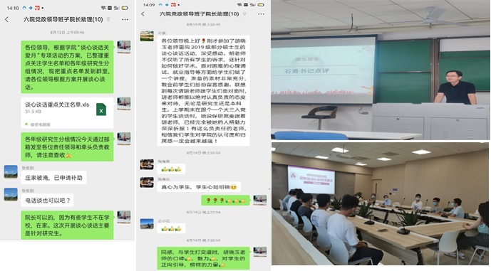 党委书记石勇通过“三个一联系”制度,与研究生一支部展开网上交流“恳谈会”,谈心谈话同时,指导同学们做好“人生规划”,鼓励大家立足现阶段本职,发挥个人能量,与学校同行同步合力战胜疫情, 以实现个人梦想。学院院长张校刚电话联系河南受灾学生,关心询问家中情况,是否需要申请资助。老师们与同学们一边谈话与学生交流心情,一边立即解答或处理学生提出问题,提醒学生,处理好科研和生活的关系,科研不是全部,同学们有自己的生活,不要整天泡在实验室里,要适当的调节自己,在其他方面提高自己,全方面发展,对学生释放压力、关爱自身有很大的作用。