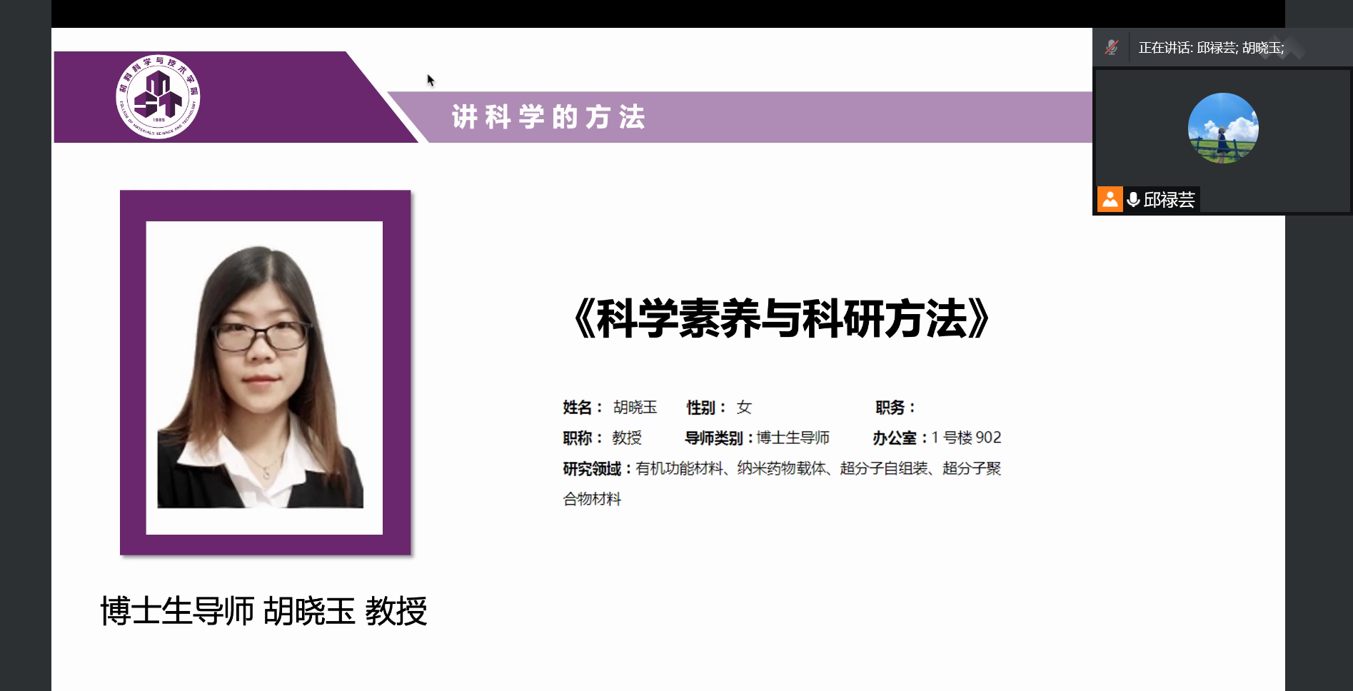 为促进我院研究生科学素养的提升,进一步增强创新精神、提高科研能力,2021年12月6日,我院邀请博士生导师胡晓玉开展科学素养与科研方法讲座,2021级全体研究生参加。