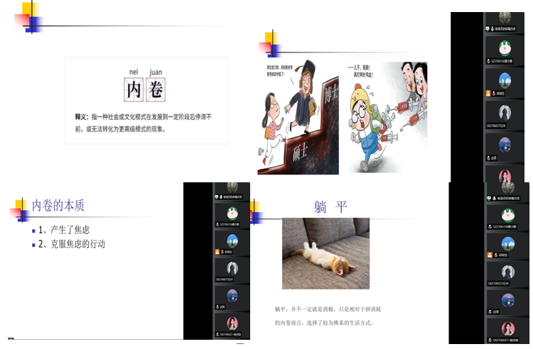 首先,杨雪花结合当今时代下的具体事例介绍了内卷的含义。紧接着,又介绍了内卷的对立面躺平,告诉同学们躺平在某种程度上并不一定是一种消极行为,两者其实都是为克服焦虑而做出的行动。