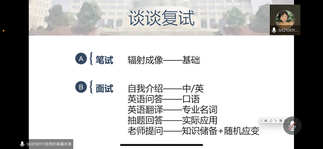 不宁唯是,为帮助本院考研学生了解复试架构,掌握复试秘诀,提升复试上岸率,同时,切实保障疫情防控期间考研复试工作顺利进行,3月7日至8日,学院邀请到3位2020届优秀考研学生,面向大四年级3个专业共100余位学生开展“学长学姐说——复试经验分享会”活动,学长学姐分别从复试流程、复试准备、复试技巧、导师联系、心态调整等多方面开展专题分享,帮助大四学弟学妹们全面系统了解考研复试,正确调整复试心态,促进学习经验在年级间的传递。