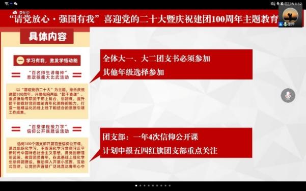 接着,院团委书记徐萍向全体团支部书记解读了我校“请党放心·强国有我”喜迎党的二十大暨庆祝建团100周年主题教育活动的具体内容。结合校院两级“团干赛课”赛程安排,重点介绍了“百名师生讲精神”思政技能大比武活动。她强调,“团干赛课”是团支部书记上讲台、讲团课的重要平台,是增强团支部书记战斗力的有力途径,要求各年级团支部书记高度重视、认真筹备、赛出风采。徐萍还对近期工作进行梳理与布置,介绍了团员发展流程,要求各团支部书记需牢固掌握团务知识,扎实开展团内工作,共创更好的团支部。