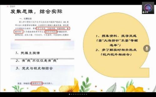 为进一步提高团课质量,提升团支部书记讲团课水平,学院邀请了江苏省大学生演讲比赛一等奖获得者裴璐以及2021年江苏省“团干赛课”一等奖获得者陈龙进行专题培训。裴璐从选题、素材收集与选取、团课形式、表达方式等方面进行分享。陈龙结合自身参赛经历,以思维导图的形式分享了体会与收获。