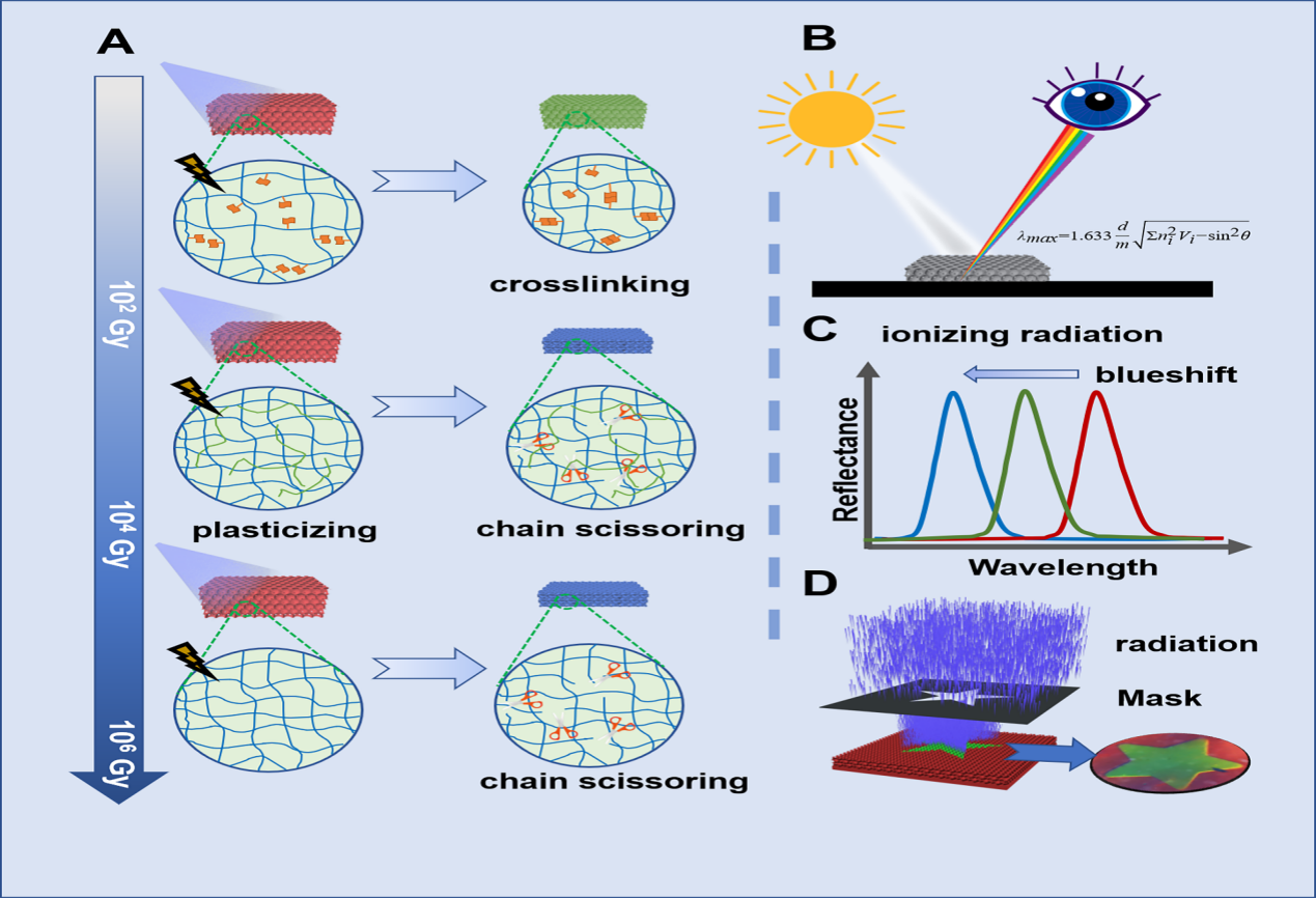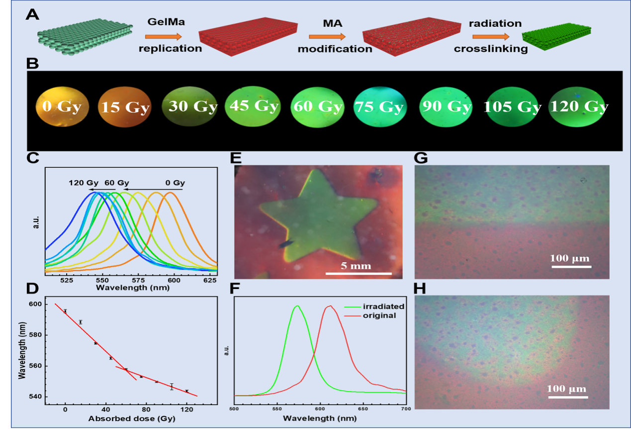 近日,我院王运龙博士、马骏教授,中国科学技术大学汪谟贞副教授,苏州大学王殳凹教授等合作在Cell Press细胞出版社期刊Matter在线发表了一篇题为“Color-phase Readout Radiochromic Photonic Crystal Dosimeter”的研究论文,提出一种基于光子晶体结构色变化的全新辐射剂量计概念,并采用多种光子晶体进行了概念验证,获得了不同灵敏度的剂量计,有望应用于辐射加工、大科学装置束流校准与放射医学剂量验证等领域。该论文我院博士生王志浩为第一作者, 中国科学技术大学高分子科学与工程系博士生葛志青为共同第一作者,王运龙博士为通讯作者兼共同第一作者,马骏教授与王殳凹教授为共同通讯作者。