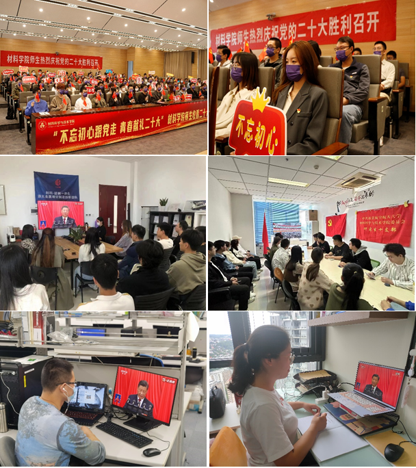 为营造氛围,材料学院通过布置“喜迎二十大 奋进新征程”主题海报、电子屏、学院网站等在学院内营了迎接党的二十大胜利召开的浓厚气氛。