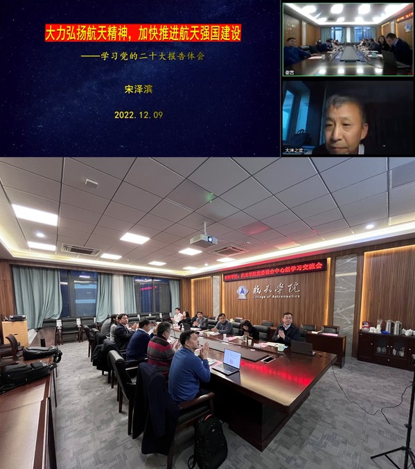 为深入学习贯彻党的二十大精神,大力弘扬航天精神,加快推进航天强国建设,12月9日我院联合航天学院举行党委理论学习中心组联合学习交流会。学院党委书记石勇,院长张校刚,党委副书记庄晓舒,副院长汤晓斌、陶海军、刘周成,航天学院党委书记孙占久,常务副院长陈金宝,党委副书记林晓,副院长盛庆红、朱旭东、王寅出席会议。会议由孙占久主持。