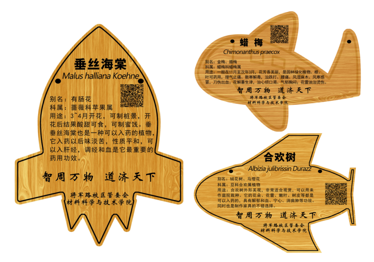 前期,同学们与管委会王建学老师共同整理了校区常见树木名称、科属、习性、产地等植物相关信息,并结合学校“三航”特色,设计了外观大方、精美适用的树木标牌。