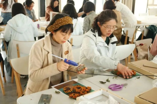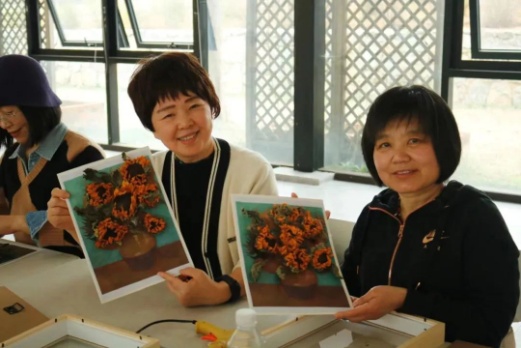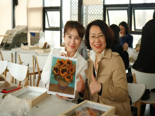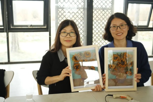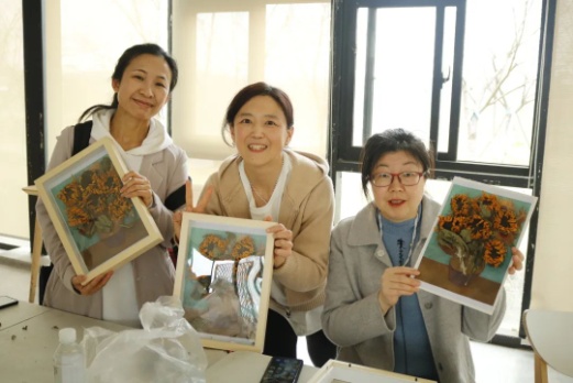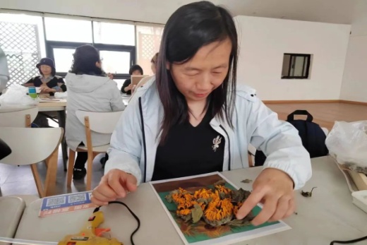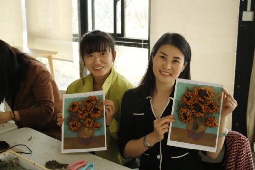 指尖芬芳,花漾人生活动——《梵高的向日葵》干花相框制作环节,花艺指导老师结合实物,为大家详细介绍了花材知识、插花艺术、干花搭配和裁剪、造型设计等插花步骤和技巧,展示了高雅的花艺作品也是创新的成果。老师们结合自身的想象力和创造力,融合自我审美感受,沉浸在创作中。整个过程,大家谈笑风生,互相欣赏,发挥奇思妙想,最终呈现出了一件件寄托对美的理解和感悟的精美作品,充分展示着女性同胞热爱生活、昂扬向上、追求真善美的精神风貌。