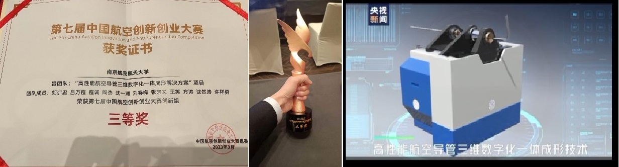 我院柔性成形技术及装备团队项目《高性能航空导管三维数字化一体成形解决方案》在2022年的复赛中成功脱颖而出,入选全国十五强,同时代表南航参与到这次的全国总决赛中。经过激烈的角逐,我院柔性成形技术及装备团队荣获第七届中国航空创新创业大赛全国总决赛创新组三等奖,并受到央视新闻的重点报道!