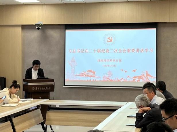 纪检委员王运龙带领大家学习了习近平总书记在中国共产党第二十届中央纪律检查委员会第二次全体会议上发表的重要讲话精神。会议指出,习近平总书记的重要讲话,深刻阐述了健全全面从严治党体系的目标任务、实践要求,对坚定不移深入推进全面从严治党作出战略部署,是深入推进新时代党的建设新的伟大工程的根本遵循,今天支部组织党员教师集体学习,为学院学科发展、学生培养提供了坚强保障。