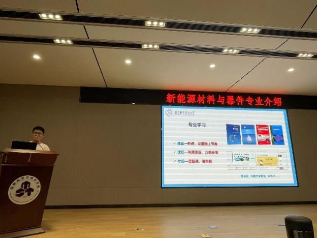 首先,2019级优秀毕业生代表雷志浩同学分享了他自己的求学经历,鼓励同学们要勇于尝试不要畏惧失败,品味在学习过程中获得的乐趣与经历,不断攀登,始终坚定自己的目标朝前看。雷志浩同学亲切的言语与体会引发同学们的共鸣,同时更为有效地让同学们了解专业概况,学习“过来人”的经验,明确自身定位。随后,专业负责人张校刚教授向同学们介绍了专业详情,从专业发展史、师资力量、建设发展,讲到国家计划、专业定位、专业培养以及专业发展方向、就业前景与典型案例。张校刚深入浅出的演讲使得同学们对“新能源材料与器件”专业,有了更深刻的理解与认知。