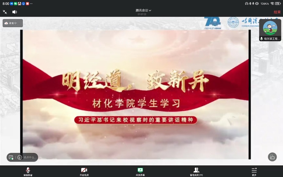 首先,参会人员共同学习习近平总书记在哈尔滨工程大学考察时的重要讲话精神。哈尔滨工程大学材料科学与化学工程学院李佳明分享道:“作为国防七子,我们要践行军工精神,把忠诚刻进基因、融入血脉、化作行动,紧贴强国强军需要,积极担当作为,为实现强军梦贡献自己的力量。”