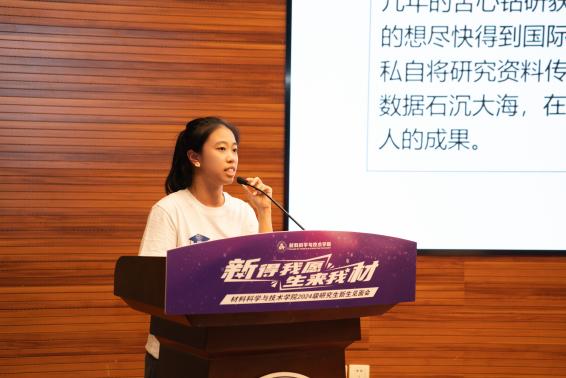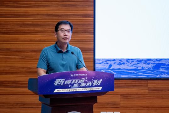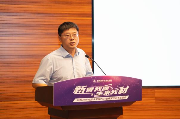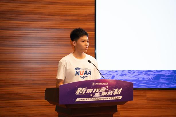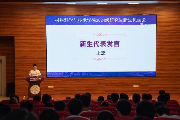 2024级博士生王杰作为新生代表发言。他总结自己在材料学院两年的读研经验,鼓励新生迎接挑战、实干创新、丰富生活,并将在攻读博士学位的新征程上继续强化专业本领,服务国家需求。