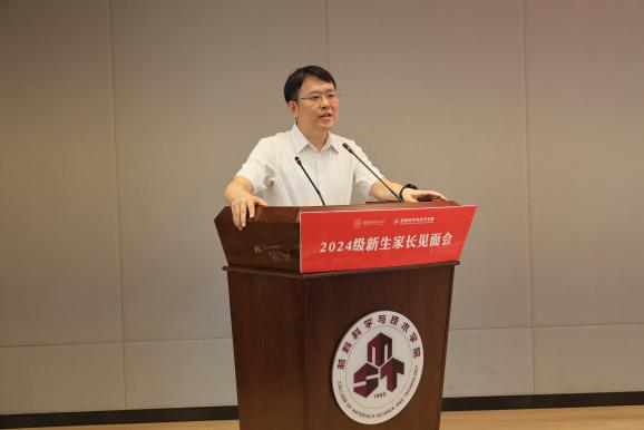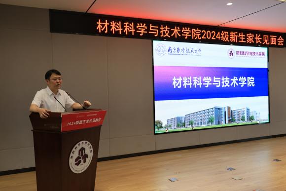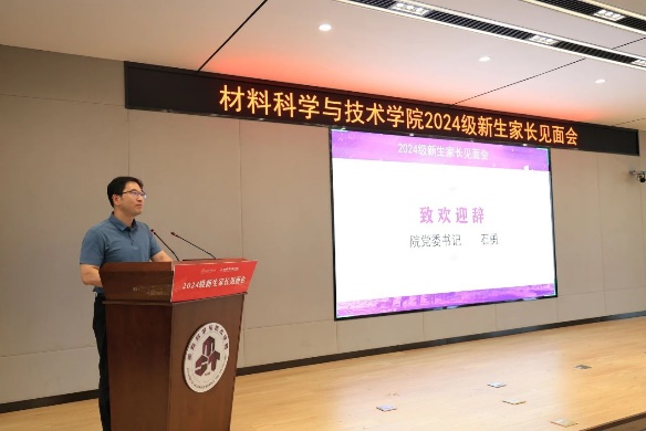 石勇代表学院致欢迎辞,他从“孩子来到材料学院,能收获什么”切入,用“三个成”与各位家长共勉。