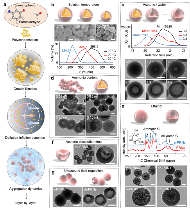 通过酚醛缩聚反应可以在纳米微米尺度上设计形貌,从而产生一系列结构精美的酚醛树脂纳米颗粒。为了精细操纵形态,探索了不同实验条件下的关键酚类生长动力学,包括温度、有机蚀刻溶剂和氨浓度。基于酚醛生长动力学对纳米结构形成的发现,调整了正交实验,通过修改酚醛生长动力学或引入新的动力学来开发变异的空心结构,如多孔空心、碗状空心和链状空心。