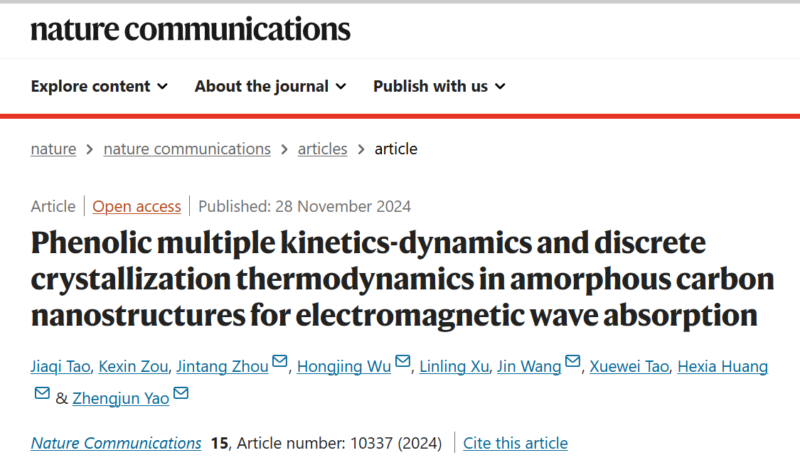 我院姚正军教授团队在《Nature Communications》发表论文:非晶碳纳米结构中的酚醛多重动力学和离散结晶热力学用于电磁波吸收