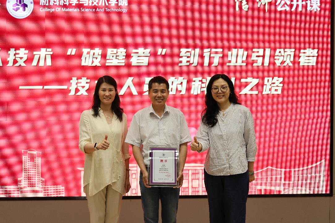 公开课上,庄晓舒、潘蕾为费传军颁发“必威BETWAY西汉姆联行业思政导师”聘书。