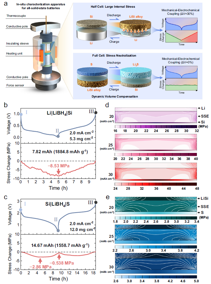 随着电动汽车和便携电子设备对高能量密度电池需求的激增,硅负极因其极高的理论容量和丰富的资源储量,被视为下一代锂离子电池的理想负极。然而,硅在充放电过程中剧烈的体积膨胀导致电极粉化,界面接触失效等问题,严重限制了其实际应用。在固态电池中,固态电解质的刚性结构难以缓冲硅的体积变化,局部应力累积会引发锂枝晶生长和电池短路,成为制约高能量密度固态电池发展的核心瓶颈。因此如何在全固态电池体系中精准调控应力平衡,成为突破高能量密度电池技术的关键。