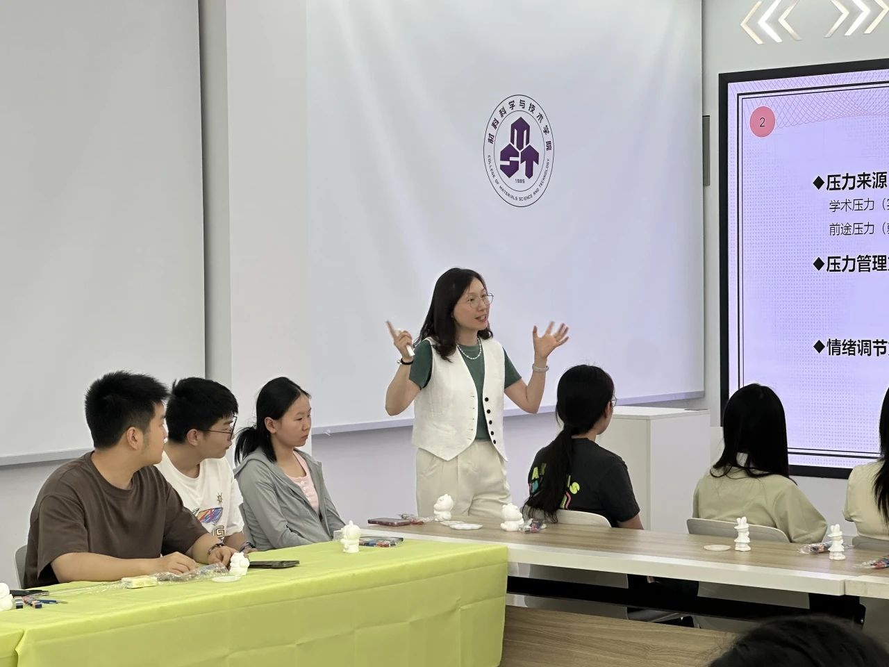 陈瑜老师针对研究生群体常见的压力源,分享了“正念冥想”、“幸运日记”以及适度运动等心理调节技巧,引导同学们调整观念、正视情绪,并鼓励大家通过石膏娃娃作品互评展开互动,进一步提升参与感、获得感和幸福感。
