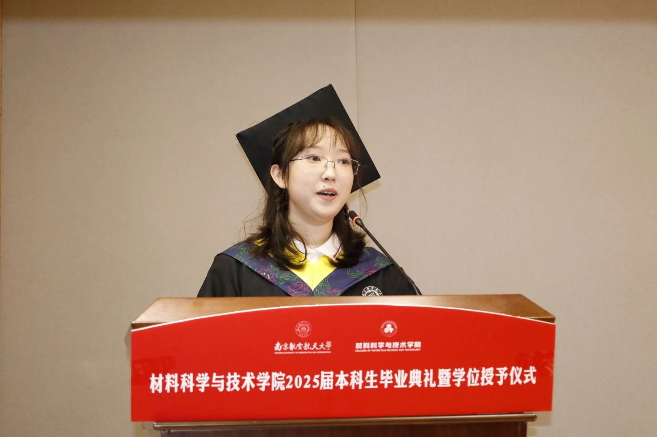 校优秀毕业生材料科学与工程专业杨馥娜作为毕业生代表发言,她深情回顾了大学四年,感恩学院提供的优质平台、老师们的悉心教导以及辅导员细致关怀,感谢同窗情谊。毕业生将带着“智周万物、道济天下”的校训精神和“红色基因、蓝色梦想”汇聚的材紫底色,迈向更广阔天地的新起点。