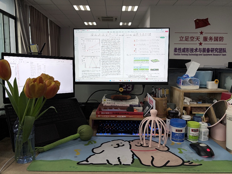 在我的工位,长时间的学习科研与身心的舒适放松可以同时在线。这个小小的空间不仅有专注高效的工作氛围,更萦绕着对自己温柔的关照感。触手可及的艾草锤能及时缓解肩颈的僵硬,按摩梳随时为大脑带来片刻清明,整齐摆放的保健品则默默守护着每日的健康基线。它们让高强度的学术日常变得可持续,也让我在追逐知识的路上,始终记得照顾好出发的自己——这大概就是我的工位独有的“治愈力”。
